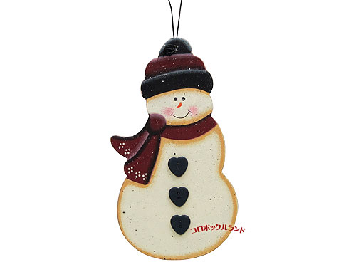 ハートのボタンがワンポイントのスノーマンの木製プラキューです。