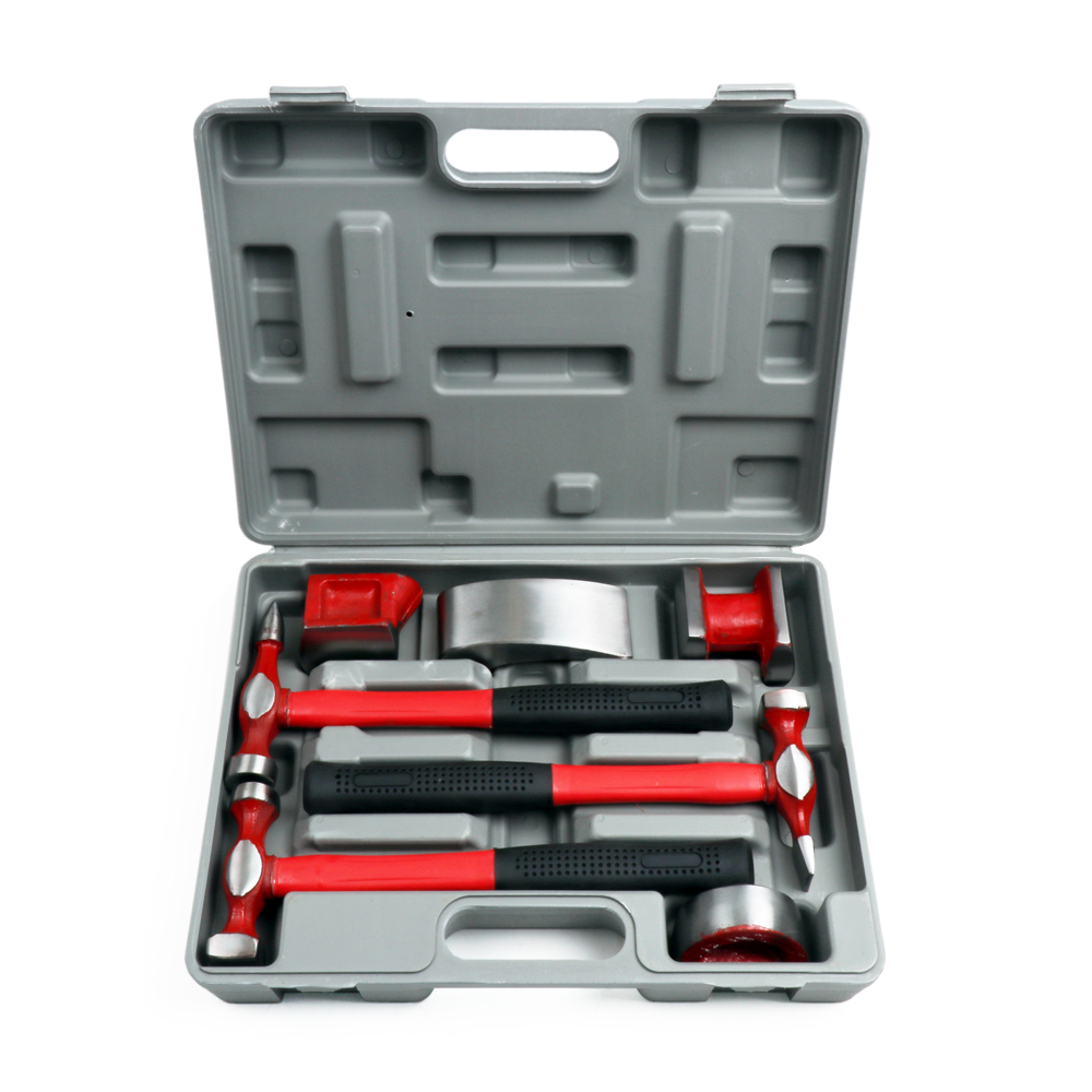 4種類の形状のハンマーヘッドを組み合わせた板金ハンマー3本と4種類のドリー(当て盤)