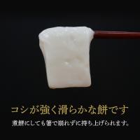 滑らかで、甘み、香り、こしが強く、煮餅でも溶けず、焼けば香り豊かなお餅です。