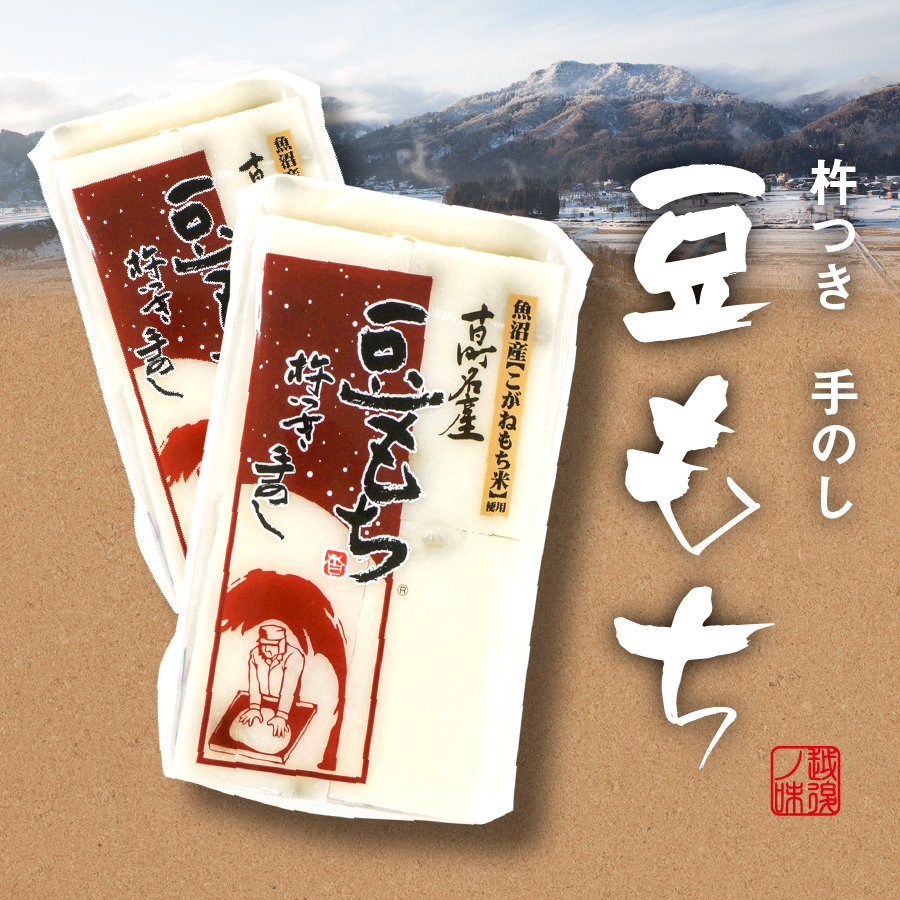 魚沼産こがねもちを100%使用し、杵つき、手のしでしあげたお餅です。青大豆は十日町産を使用しています。甘みがあり、豆の味もしっかり感じられる青大豆です。滑らかで、甘み、香り、こしが強く、焼けば香り豊かなお餅です。薄い塩味がついています、あんことの相性が良くお汁粉に入れるなど、おやつ、お茶うけに最適です。