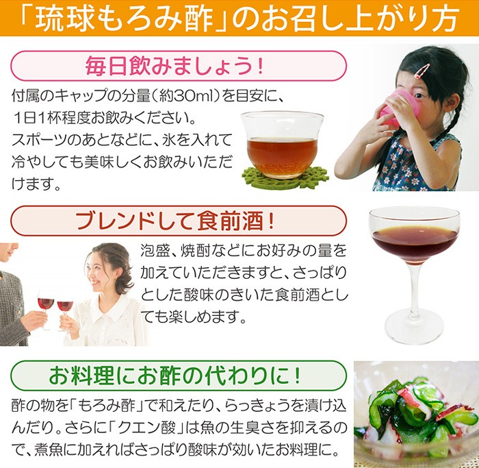 琉球もろみ酢は泡盛の製造過程で生まれるもろみを圧搾・濾過・調合したもので主成分はクエン酸です。酸味は食酢の3分の1程度で鼻にツンとくる刺激はほとんどなくストレートで飲んでも胃の粘膜を傷めることはありません。