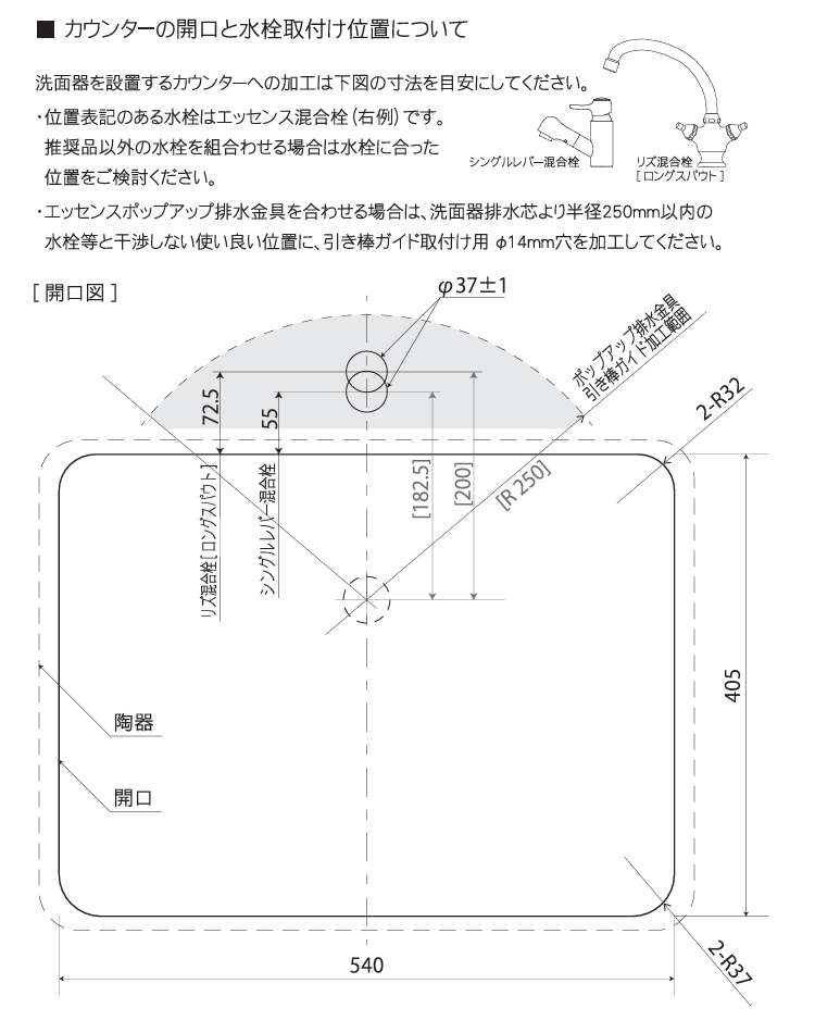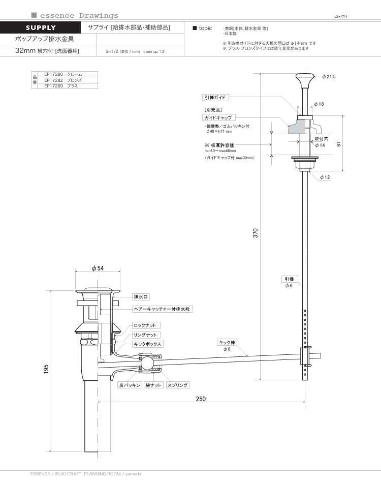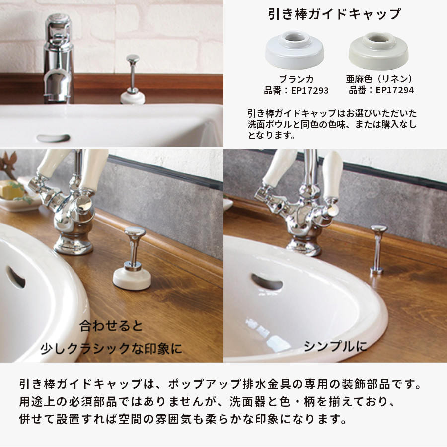 | 構成商品の品番 | 1,洗面ボウル:E274240またはE350060 2,ポップアップ排水金具:EP17280 3,引き棒ガイドキャップ:EP17293またはEP17294 |