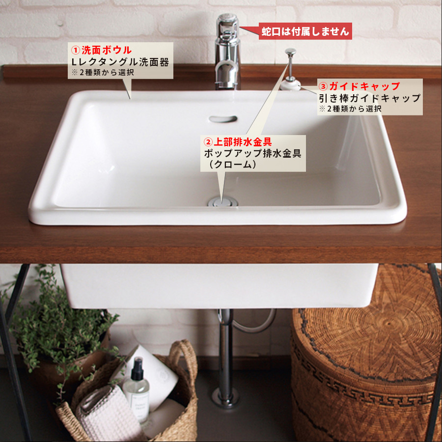 | 商品名 | Lレクタングル洗面ボウル&ポップアップ排水金具&引き棒ガイドキャップ【3点セット】 |