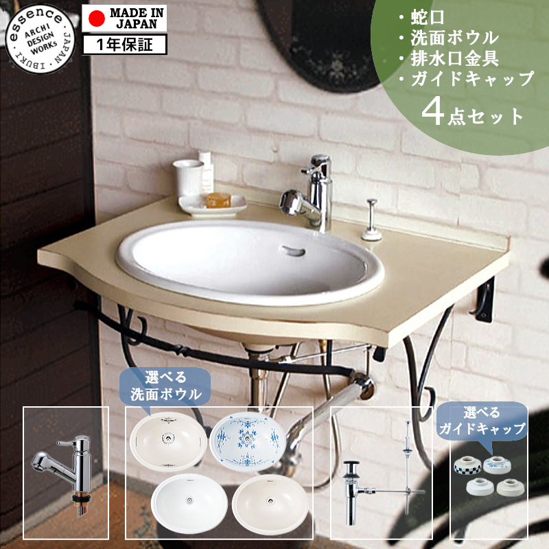 | セット内容 | 1,水栓本体(固定パッキン・ナット含) 2,洗面ボウル本体 3,排水口金具本体 4,引き棒ガイドキャップ本体 |