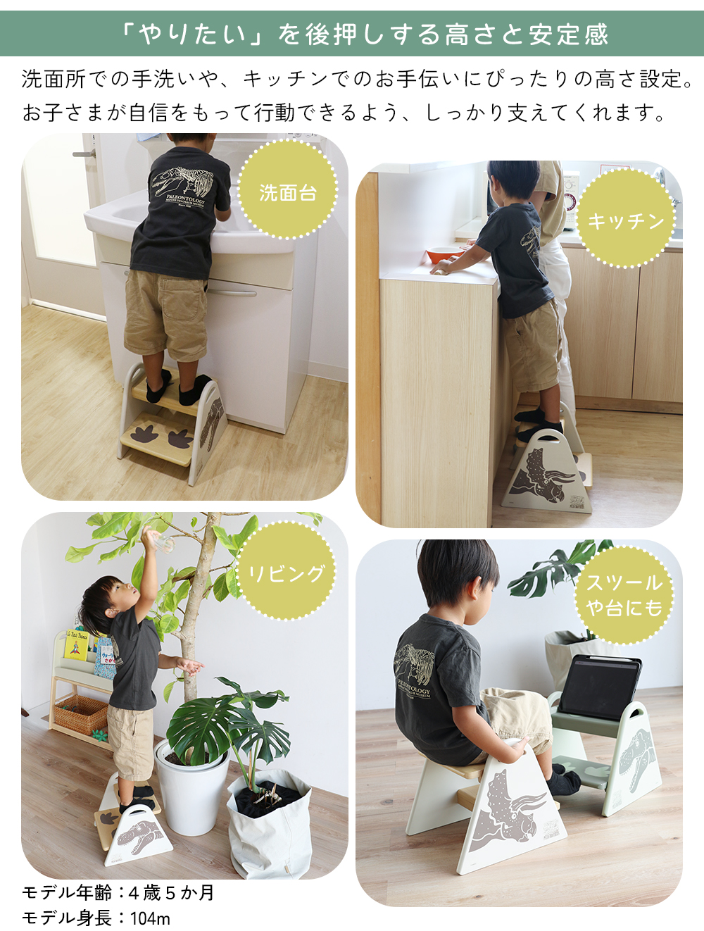 洗面所での手洗いや、キッチンでのお手伝いにぴったりの高さ設定。