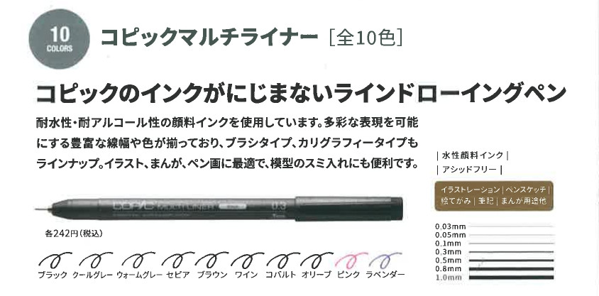 ・耐水性の顔料インクを採用した、コピックににじまないラインドローイングペンです。