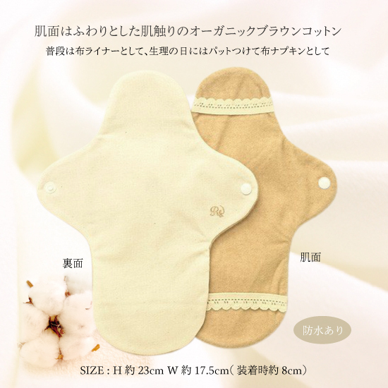 普段は布ライナーとして、生理の日には付属のパットを付けて布ナプキンとして快適にご使用頂ける万能アイテムです。肌面は上質なオーガニックブラウンコットンを使用。