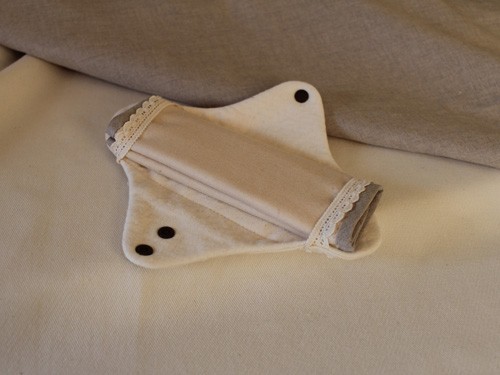 少量のおりものや冷えとりとして使う際は、ホルダーのオーガニックリネンの面を肌に当て下着に取り付けて薄手で使用することもできます。(パッド固定用のレース紐が気になる場合は裏に折り返して使用して下さい。)