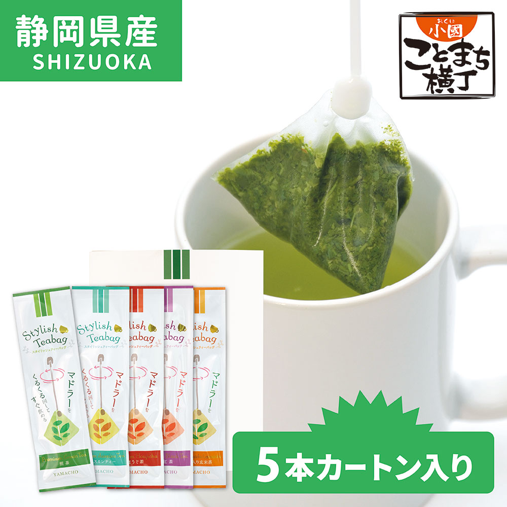 ティーバッグにスティックを付け、簡単にお好みの濃さに調整できるお茶です。5種類のお茶を贈り物におすすめなギフトカートンにしました。