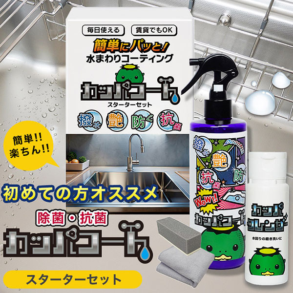 | 用途 | 【カッパコート】 シンク、洗面台、トイレ等の防汚・撥水処理 ※滑るため浴室へのご使用は控えてください。 【カッパクレンザー】 シンク・カラン等の研磨 |