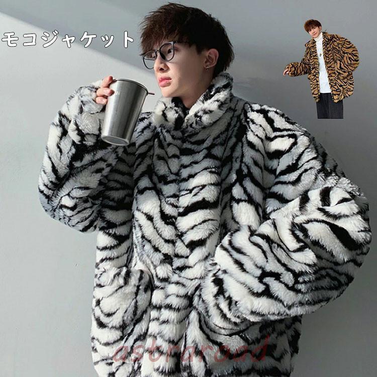 フェイクファージャケット メンズ ゼブラ柄 シマウマ柄 ファーコート ボアジャン ボアコート ロングコート ボア 韓国 ファッション ボアジャケット