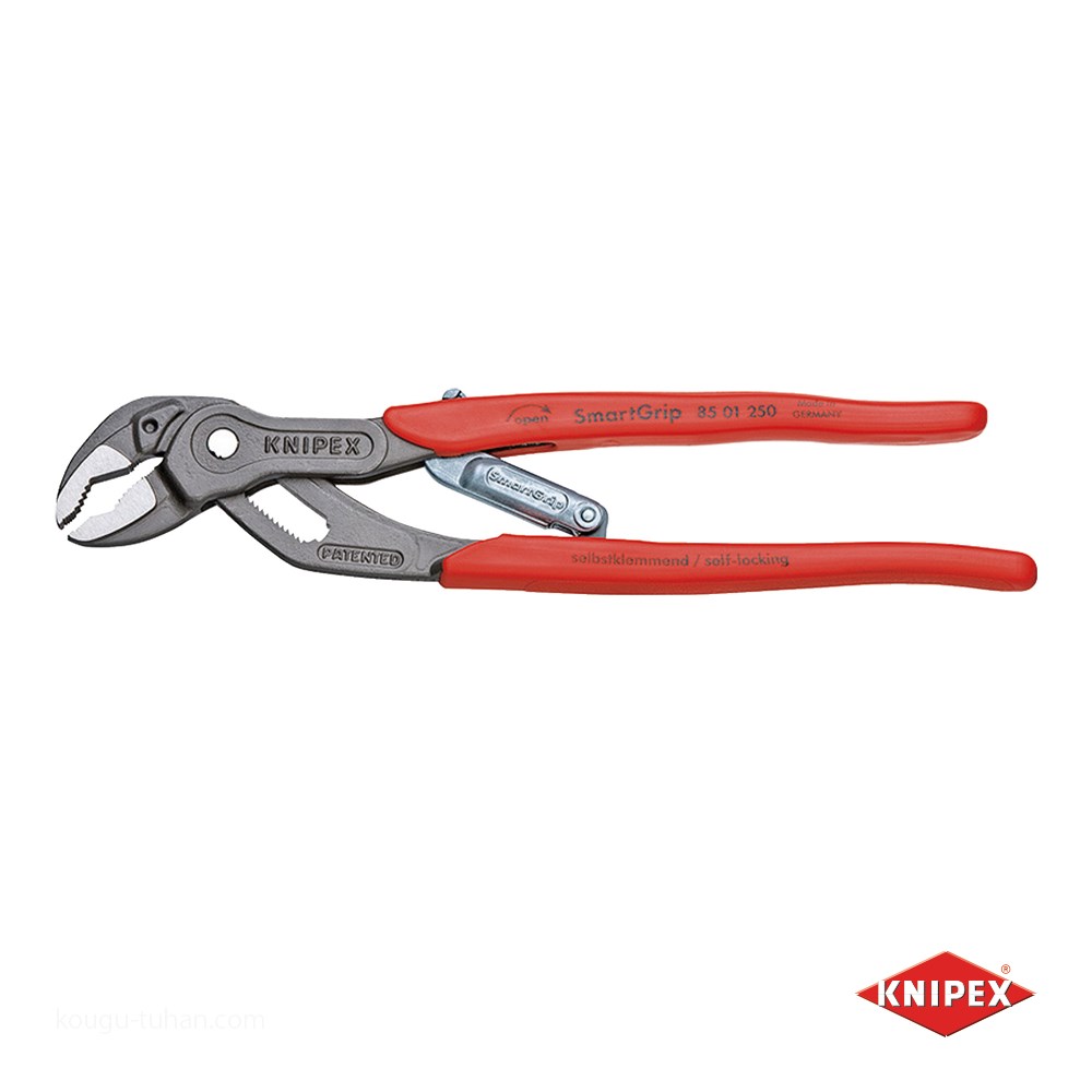 ンで高いグリップ力を発揮します。入念な焼入れ処理が施されたつかみ面の硬度は約HRC61で、耐摩耗性が高く、確実なグリップを発揮します。材質はオイル焼き入れ焼き戻し処理済みのクロームバナジウム電気鋼。対象物を挟むだけで、自動的に最適な口幅に調節されます。頻繁に異なるサイズの対象物を掴む作業の際に、サイズをその都度調節する必要がありません。ボタンでのサイズ調節が不要なので、左利きのユーザー、右利きのユーザー共に違和感なく作業できます。収納時にかさばらないように口を閉じてロックできるレバーを装備。口幅は細かく自動調整されますので、ハンドルの握り幅も常に最適な幅に調整されます。片手操作でワークへのアクセスを良くするためにスリムなヘッドデザインで、より狭い場所での作業に最適です。