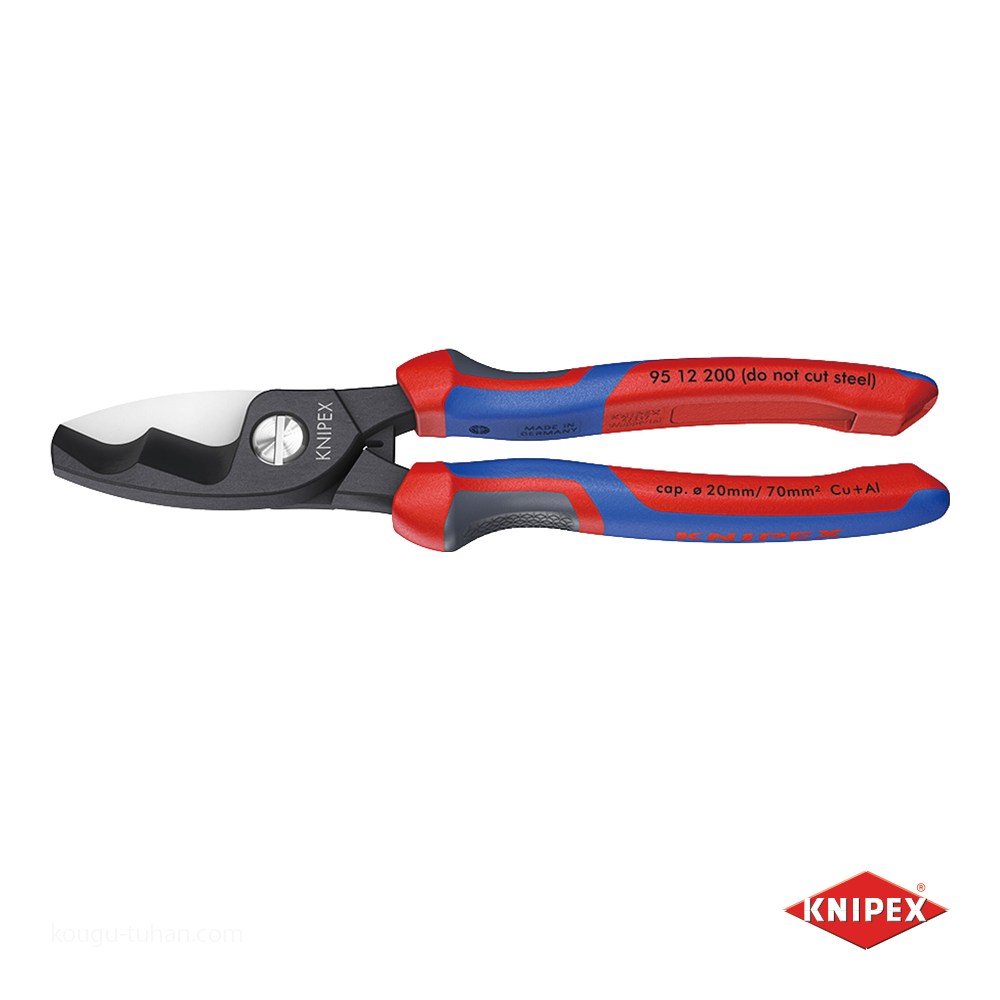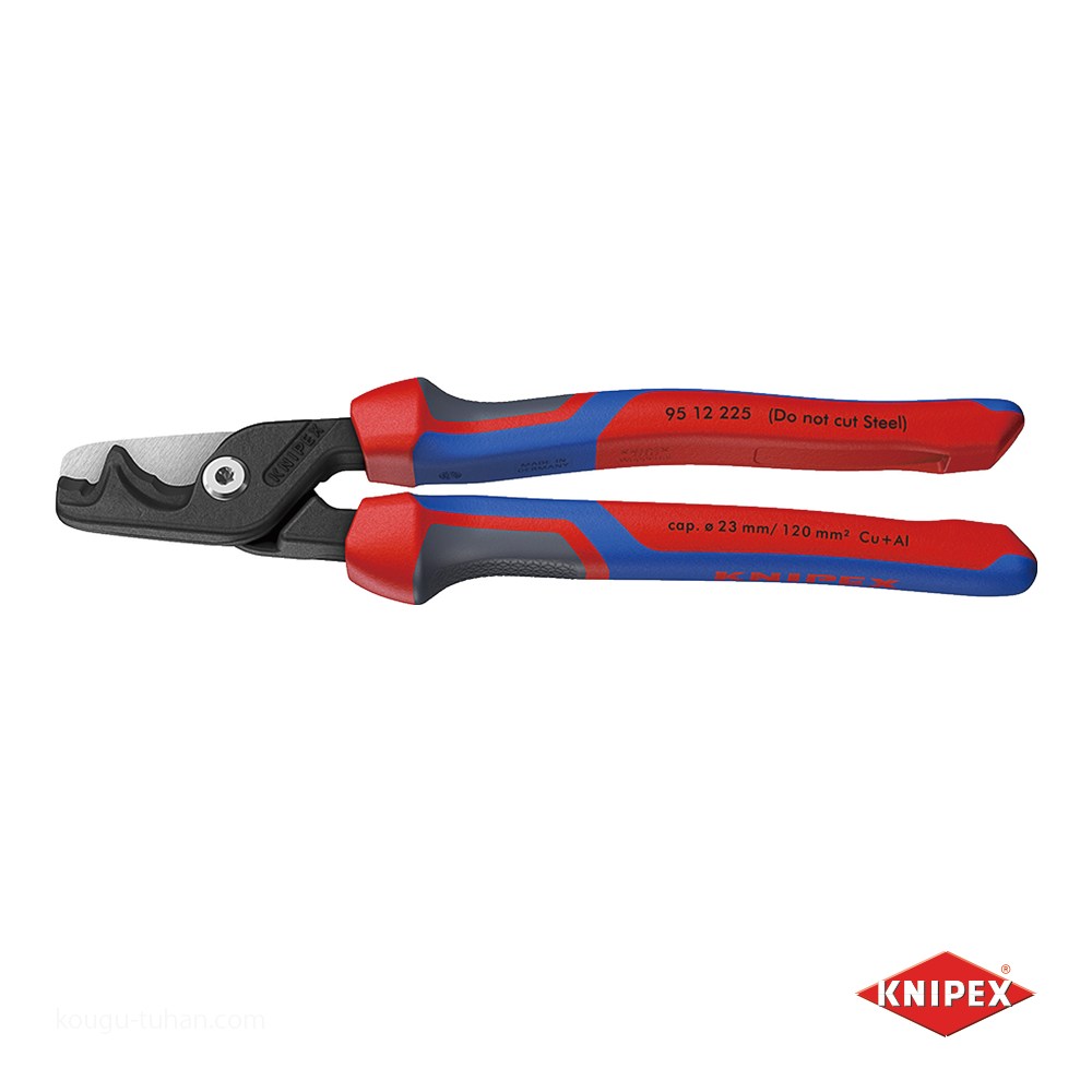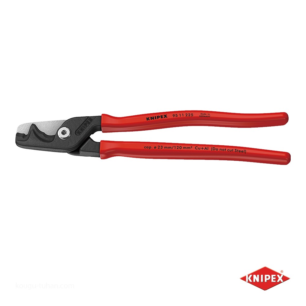 リングを実現する人間工学に基づいた3つのコンポーネントで構成されており、機能が拡張できるKNIPEXtendインターフェイスが2つ装備されています。強力ジョイント、長いハンドル、刃先の最適化:コンパクトなケーブルカッターよりも明らかに軽い切断ができます。高い切断能力:最大35 mm2の単銅ケーブルおよび アルミニウムケーブル、最大70 mm2のより線ケーブル、および最大120 mm2の細径より線ケーブルを切断可能です。二重の切断領域:ジョイント近くに大小のケーブル を保持する段付刃と、特大ケーブルを段階的に切断する先端刃が特徴です。片手または両手で簡単に操作でき、最小限のハンドル開口部で大径ケーブルに対応します。アクセスしやすいスリムなヘッドです。ACSRなどの鋼心ケーブルには適しません。レーザー焼き入れによって約56 HRCまで硬化された刃先が特徴です。