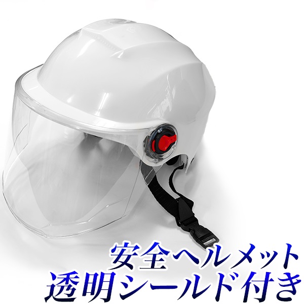 ■シールド付きヘルメット 透明ガード付き安全帽色 : 白 ベルト、ゴムパーツ : 黒サイズ : 頭囲 約 55cm 〜 62cm小学生以上の子どもから大人まで使用できるサイズです。XLサイズまで調節可能。重量 : 約 430g材質 : 樹脂作業用 防護ヘルメット、自転車ヘルメットとして、とても軽量簡易な商品。一般的なヘルメットの前面に、透明なシールド(フェイスガード/クリアバイザー)が付いています。強風やホコリ、飛び石、土煙、砂煙などから顔や目を保護するヘルメット。自転車用ヘルメットとして、頭部だけでなく顔全体を守ります。枝打ち、除草作業や、切削作業等、屋外作業全般における怪我の防止に。汎用性の高いヘルメットです。透明シールドは、約70度の範囲でフリップ開閉でき、取り外して使用することも可能です。マジックテープバンドによるサイズ調整が可能で、頭の大きさに合わせることが出来ます。実測で頭囲およそ55センチから62センチワンタッチバックルで、脱着が容易におこなえます。ゴム製のアゴ当て付き。オートバイ、原付では使用できません。入荷ロットにより、アゴのゴムパーツの色やベルトが異なる場合があります。ご了承ください。。製造時、保管中、輸送中にシールドに擦れ等が付くことがございます。ご了承ください。※透明シールドの取り付け方は、商品画像または同梱の取り付け説明書をご覧ください。簡単に取り付け可能です。