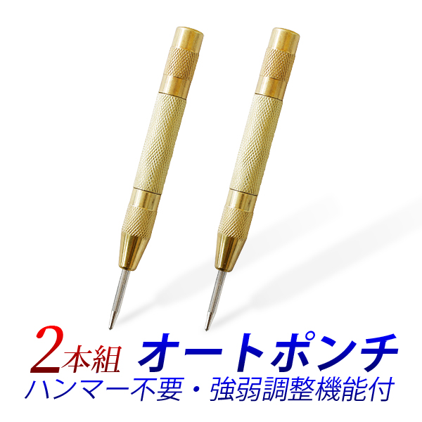 【送料無料】※ポスト投函の為、日時指定不可※お届けまでに2日程、離島の場合は1週間程、配達日数をいただきます。※厚さに制限があるため、梱包は簡易なものになります、ご了承ください。■ オートポンチ、オートマチック センターポンチ 2本組セット全長 約130mm重量 : 約70g本体材質 : 真鍮 先端材質 : 硬質チップ押し付けることで対象物に凹みをつけます。天井、壁、床面など作業場所を選びません。ドリルなどで下穴を空ける際に使用します。薄物鋼板、ステンレス、強化樹脂、プラスチック、木材などに幅広く使えます。点のケガキに使用できます。頭部を左右に回すことで、強弱の調整ができます。未使用の状態ですと動きが渋い場合があります。その際は、厚い雑誌の上で、何回か作動させてから使用してください。連続してパンチしたい時は、先端側のネジを少し緩めて、使用してください。新しいポンチは、スプリングが強く効いて、ノッチの戻りが悪い場合があります。ご了承ください。