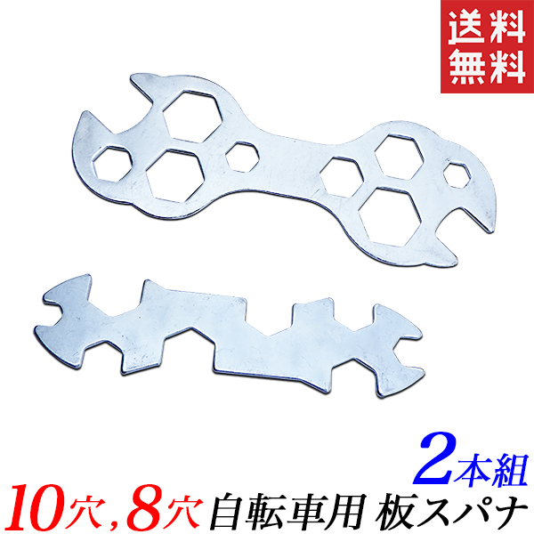 【送料無料】※ポスト投函の為、日時指定不可※お届けまでに2日程、離島の場合は1週間程、配達日数をいただきます。※厚さに制限があるため、梱包は簡易なものになります、ご了承ください。■自転車用 板スパナ 2本組使用頻度の高いサイズに対応した、10穴と8穴の2本セットです。10穴スパナ 適合サイズ(mm) : 8、9、10、12、13、14、15(2ヶ所)、16、178穴スパナ 適合サイズ(mm) : 8、10、12、13、14、15、16、1710穴スパナ 寸法 : 長さ 約130mm x 幅 約46mm x 厚さ 約2mm8穴スパナ 寸法 : 長さ 約123mm x 幅 約32mm x 厚さ 約2mm10穴スパナ 重量 : 約40g8穴スパナ 重量 : 約30g自転車の修理やメンテナンスに役立つ、簡易スパナです。薄型なので、狭いスペースでも作業が可能です。コンパクトなので、携行するにも便利です。自転車以外にも、サイズが適合すればあらゆる用途で使用できます。表面に保管中の擦れなどがある場合があります。格安アウトレット商品のためご了承ください。過度な力を加えると、破損しますのでご注意下さい。薄型スパナ 携行レンチ 板型レンチ マルチレンチ 万能レンチ ハブコンレンチ※細かな擦れ・汚れ等が有る場合がございますが、格安商品の為ご了承ください。