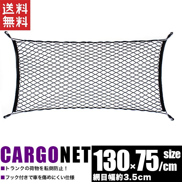 【送料無料】※ポスト投函の為、日時指定不可※お届けまでに2日程、離島の場合は1週間程、配達日数をいただきます。※厚さに制限があるため、梱包は簡易なものになります、ご了承ください。■カーゴネット 130cmx75cmネットのサイズは、およそ115cmx58cmフックからフックまでの長さ およそ130cmx75cm外周部分の材質はゴムなので伸縮します。様々な幅やサイズにご利用できます。ネットは2.5mmナイロン製、ネットの上下には4.5mmのゴムひもが使われています。網目の間隔は、およそ3.5cmと狭く、しっかりと荷物を保持します。縦に使用することも、平らに敷いて使用することもできます。スノーボード、ゴルフバッグ、ラケットバッグなどをミニバンに縦積み出来ます。伸縮性と柔軟性に富んだカーゴネット。固定する箇所の位置が良ければ、純正オプション、純正パーツのような使い勝手になります。車用ネット類には、「標準ネット」「網目二倍ネットW」「カーゴネット」「グリーンネット」などの取り扱いがございます。