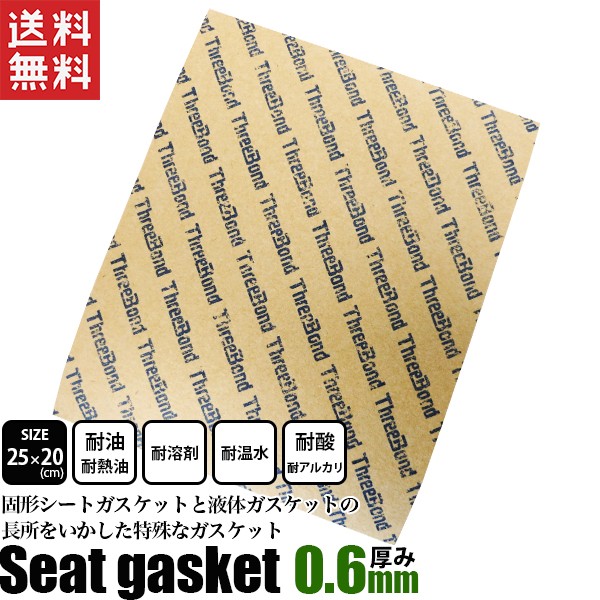 【送料無料】※ポスト投函の為、日時指定不可※お届けまでに2〜3日程、離島の場合は1週間程、配達日数をいただきます。※厚さに制限があるため、梱包は簡易なものになります、ご了承ください。■シートガスケット シートパッキン 厚さ 0.6mmサイズ 約250mm × 約200mmスリーボンド社製 206S必要なサイズに、自由に切って、ガスケットやパッキンとして使えます。固形シートガスケットと液体ガスケットの長所をいかした特殊なガスケットです。強靭な繊維質材料に、特殊な粘性体の液体ガスケットを含浸させて作ってあります。【中面圧用】 締め付け面圧基準 80〜160Kg/cm2【使用温度範囲】 −40〜+150度『耐温水』 『耐酸』 『耐アルカリ』 『耐ガソリン』 『耐溶剤』 『耐油』 『耐熱油(150〜200度)』 特に耐油に優れます。ガスなどの気体には不向きです。