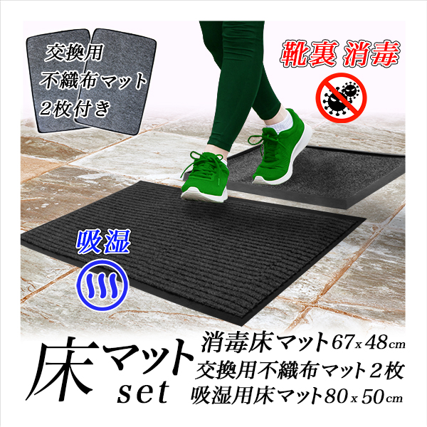 消毒床マット 交換用不織布マット2枚 吸湿用床マットのセットサイズ 消毒床マット(ゴムマット) 横 約67cm x 縦 約48cm x 最厚部 約23mm交換用不織布マット 横 約60cm x 縦 約40cm x 厚さ 約3mm吸湿用床マット 横 約80cm x 縦 約50cm x 厚さ 約7mm建物の入り口に設置。消毒床マットに、交換用不織布マットをセットして、アルコール消毒液をかけ十分に浸します。消毒床マットから進んだ場所に、吸湿用床マットを敷き足裏のアルコールをふき取ります。靴の裏についた菌の消毒に。不織布は使い捨てのため、衛生的に使用することが可能です。交換用不織布マットは、7日から10日での交換を想定しています。吸湿用床マットは、直射日光で天日干しすることで繰り返し使用できます。安全のため、玄関床マットの裏面には滑り止め加工がしてあります。消毒の効果・能力については、消毒液の濃度に左右されますのでご了承ください。 市役所や役場などに設置されている一般的なセットになります。別ページにて、交換用不織布マットを5枚セットで販売中です。商品の仕様は、入荷ロットにより変更される場合がありますので、ご了承ください。