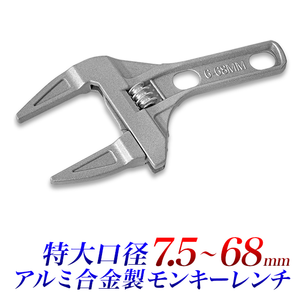 【送料無料】※ポスト投函の為、日時指定不可※お届けまでに2日程、沖縄県・離島の場合は5間程、配達日数をいただきます。※厚さに制限があるため、梱包は簡易なものになります、ご了承ください。■ モンキーレンチ 特大口径 7.5mm 〜 68mmサイズ : 縦 約200mm x 横 約95mm x 厚さ 約7mm最小開口幅 : 約7.5mm 最大開口幅 : 約68mm重量 : 約165g材質 : アルミニウム合金蛇口や、洗面器下の排水パイプの塩ビ製ナットなど、家庭用の大きなボルト、ナットに向いた商品。衛生配管のナットに傷をつけないアルミ二ウム合金製。軽量、コンパクト、ワイドタイプで狭い箇所での作業に最適。メッキしたナットや銅、真鍮などの軟質のナット類の締め付け。家庭用の配管用、パイプ用の工具なので、重機、機械などの重整備には適しません。※ ロットにより、仕上がりがきれいでないものがございます。ご使用には問題がございません。ご理解の上、ご購入願います。 ※ 入荷時期により画像と異なる場合がございます。 ご了承ください。