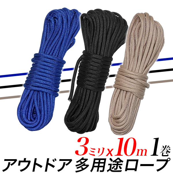 【送料無料】※ポスト投函の為、日時指定不可※お届けまでに2日程、離島の場合は1週間程、配達日数をいただきます。■アウトドアロープ 多用途 3mm x 10mサイズ(およそ) : 径3mm x 長さ10m (多少伸縮します)カラー : ブルー(青) / ブラック(黒) / ライトブラウン 重量 : 約90gアウトドア、キャンプ、ガーデンなど、多用途で使用できるロープです。シェード タープ オーニング などのロープとして便利なカラー。アウトドアではテント設営のほか、濡れた衣類を干すための洗濯ロープ、ナイフのグリップなどに。荷物の梱包用、犬のリードロープ、アクセサリー製作などの日常使いや、防災などの備えに。ガーデンやエクステリアなど、あらゆる用途、目的に使用できます。軽量 かつ 柔軟性、耐久性に優れています。3mm径のタイプ(当出品)の他に、4mm径のタイプも出品中です。タープテント用に便利な、自在金具付きのガイロープも取り扱い中です。タープテントを張る際に役立つ ペグ ・ マルチウェイト も取り扱い中です。テントロープ / キャンプロープ / ガイドロープ / ガイライン / ガイドロープ / 張り綱