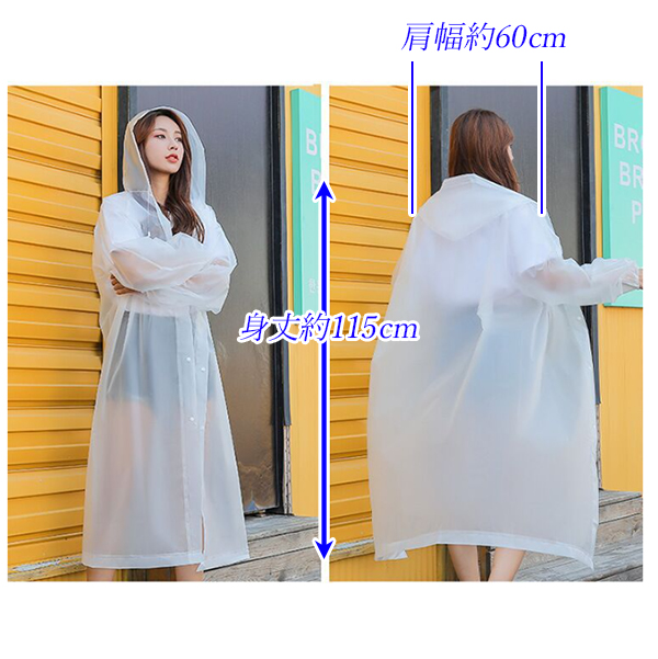 【送料無料】※ポスト投函の為、日時指定不可※お届けまでに2日程、離島の場合は1週間程、配達日数をいただきます。※厚さに制限があるため、梱包は簡易なものになります、ご了承ください。■ レインコート ビニール製 フリーサイズサイズ身丈 : 約115cm肩幅 : 約60cm袖 : 約53cm男女兼用フリーサイズ。身長 約140cm 〜 約180cmに対応。重量 : 約130g色 : 白系クリア素材 : EVA(ビニール)フード付きのレインコート(雨合羽)です。フードと顔のフィット感は、紐で調整可能です。前開き、ボタン留めタイプです。コンパクトに折り畳むことが出来て、持ち運び、旅行の携行、携帯に便利です。非常時、災害時のための常備品としても。丈夫で、水を良くはじくEVA素材です。繰り返し使用可能です。使い捨てではありません。 ビニールカッパ 雨かっぱ ポンチョ 雨具