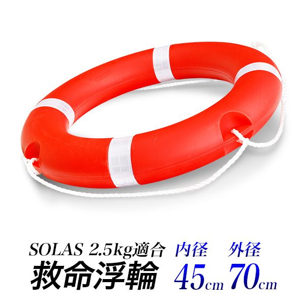 送料につきまして※北海道・四国・九州へは別途送料「200円」沖縄県へは別途送料「3500円」加算されます※■ 救命用 浮き輪 2.5kg規格品サイズ : 外径70cm 内径45cm 厚さ11cm重量 : 約2.5kg船舶装備品の認定工場で製造されたSOLAS適合品。丈夫なプラスチック樹脂製で、中空構造の中に発泡ウレタンが充填してあります。すぐに使えるので、救命用品、安全用品としても大きな効果があります。強い浮力を持ち、空気漏れもしないので、パンクしません。船内装備、港湾、河川、水路、湖畔、湖沼への設置に。通学路に救命ロープと併せて常設。防災対策品、豪雨、防災用品として保管。使用しないときは、必ず暗所で保管して下さい。紫外線、水による劣化を考慮し、使用期間は通常3年くらいを目途に、屋外に常備する場合1年を目途にしてください。設置者は定期的に点検してください。劣化や異常が見られる場合、すぐに使用を中止してください。金属製の据え付け用器具(支柱)は別売りのため、付属しません。発泡ウレタンが充填してあるので、多少表面が劣化したり、傷、凹みが付いても十分な浮力を得られます。製造ロットにより、刻印のフォントが異なります。リフレクターの仕様が異なります。救命浮輪、救命浮環、救命ブイ、リングブイ CCS2.5kg 5556