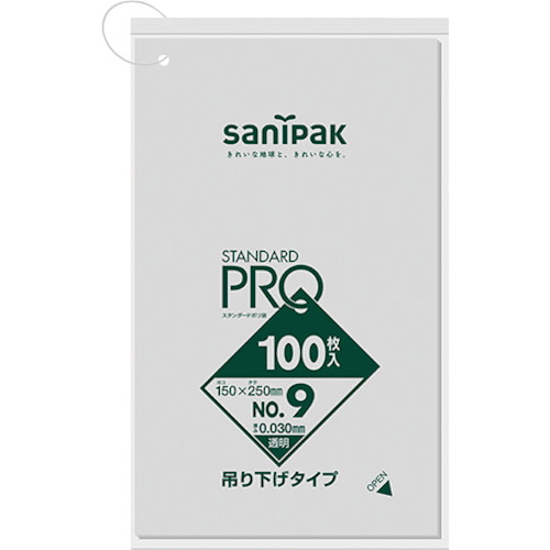 "●吊り下げタイプの規格袋です。<br>●便利な吊り下げひも付きです。<br>●片手で1枚ずつ簡単に取り出せます。<br><br>●小物類、食品等の仕分けに。<br><br>●色:透明<br>●縦(mm):250<br>●横(mm):150<br>●厚さ(mm):0.03<br>●規格(号):9<br><br>●1冊:100枚入<br>●食品衛生法適合(ポジティブリスト適合)<br><br>●低密度ポリエチレン(LLDPE)<br><br>…梱包用品 梱包結束用品 ポリ袋…"