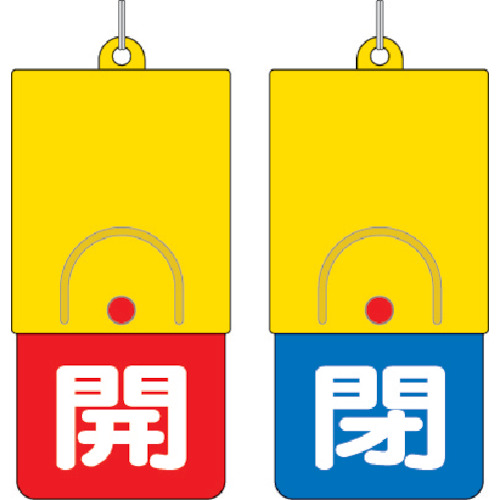 "●石油化学や半導体製造ラインなど頻繁に開閉を繰り返すバルブの表示に最適です。<br>●ロック機構により脱落しても表示が切り替わることはありません。<br>●表示切り替えは赤いロック解除ボタンを押しながら回すだけです。<br><br>●表示内容:赤地白文字/青地白文字<br>●縦(mm):101<br>●横(mm):48<br>●厚さ(mm):6.5<br>●取付仕様:吊下げ<br>●表示タイプ:開・閉<br><br>●ロックボタン切り替え式<br>●取付方法:吊り下げ(ボールチェーン金具別売)<br><br>●ABS樹脂<br><br>●ステンレス二重カン<br><br>●ボールチェーンは別売です。…工事・照明用品 管工機材 バルブ・配管識別用品…"