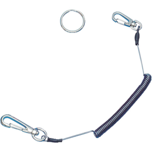 "●ポリウレタンコードにステンレスワイヤを芯材として使用し耐久性に優れています。<br>●ロープ径が細く柔軟性に優れ、コイル形状の復元がスピーディーです。<br>●ラチェットレンチ・モンキーレンチなど、接続する穴のある工具に最適です。<br><br>●工具の落下防止に。<br><br>●色:黒<br>●最大使用可能質量(kg):0.5<br>●芯径(mm):0.8<br>●コード径(mm):2.0<br>●自然長(mm):310<br>●最大長さ(mm):1100<br>●径(mm):2<br><br>●最大使用荷重:0.5kg<br><br>●芯:ステンレスワイヤ<br><br>●リング<br><br>…保護具 墜落・落下防止用品 安全ロープ…"