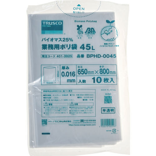 トラスコ TRUSCO バイオマス25%ポリ袋 0.016x650x800mm(45L用・透明) 10枚入 BPHD-0045