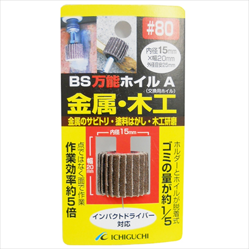 点から面で作業ができ作業効率約5倍、ホルダーとホイルが脱着式でゴミの量が約1/5になります。[用途]金属のサビトリ・塗料はがし、木工研磨。[機能]力強い研削で作業スピードが向上し、先端を交換することで作業用途が拡大します。[仕様]●サイズ:内径15mm×幅20mm。●外径目安:25mm。●粒度:80。●最高使用回転数:3000rpm。●適用工具:ドリル・インパクトドライバー。[材質]●アルミナ。…