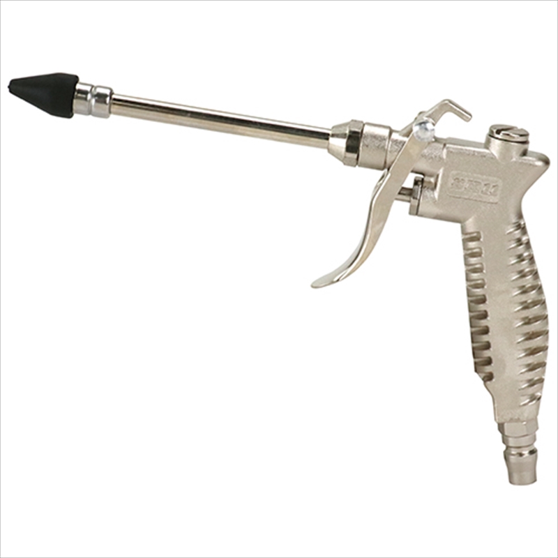 奥まった狭い場所への噴射に便利な100mmノズル付きなので、対象から少し距離を置いて作業ができます。対象物をノズル先端から保護すると同時に、ノズル先端の傷つき、破損を軽減します。ハンドル操作でエアー吐出量の加減ができます。操作しやすい大型ハンドルです。