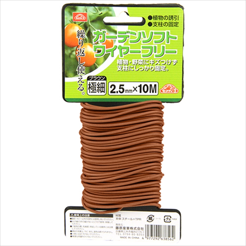 垣根・支柱の固定等に便利です。[用途]植物の誘引・支柱の固定。[機能]添え木・垣根・支柱の固定等に最適です。植物・野菜などをキズつけず支柱にしっかり固定します。繰り返し使えます。[仕様]●太さ:2.5mm・極細。●長さ:10m。●色:ブラウン。[材質]●スチール。●TPR。[注意事項]園芸・ホビー以外の目的には使用しないで下さい。お子様の手の届かないところで使用・保管して下さい。ご使用の際、先端部、突起している箇所には注意して下さい。[その他]素材の性質上、サビ・劣化・退色は避けられません。火気には近づけないで下さい。無理な荷重をかけないで下さい。…