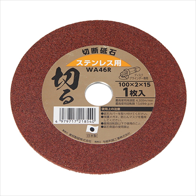 ステンレス、金属の切断に最適です。[用途]ステンレス・金属の切断作業。[機能]ステンレス材・鉄材の切断に最適です。[仕様]●外径:100mm。●厚み:2mm。●穴径:15mm。●1枚。●最高使用回転速度:4300min。●最高使用回転数:13694rpm。●粒度:WA46R。[材質]●砥材:WA(白色アルミナ)。[注意事項]使用時は防塵メガネ、マスクをご使用下さい。最高使用速度・回転数を守って使用ください。お子様の手の届かない場所に保管して下さい。…