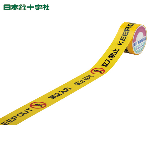 日本緑十字 標識テープ 立入禁止(4ヶ国語) INT-1 60mm幅×25m 手切り可能タイプ ポリエチレン製 (1巻) 品番:262136