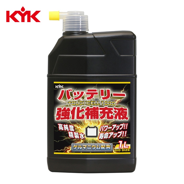 KYK バッテリー補充液|特長:タフセル1000は、1マイクロジーメンス以下の高純度精製水に新配合の有機ゲルマニウムを最適にブレンドした強化補充液です。 低下したバッテリー容量を回復し、バッテリー寿命を延命します。 バッテリー充電効率の向上、自己放電の防止、サルフェーションの防止等の効果があります。