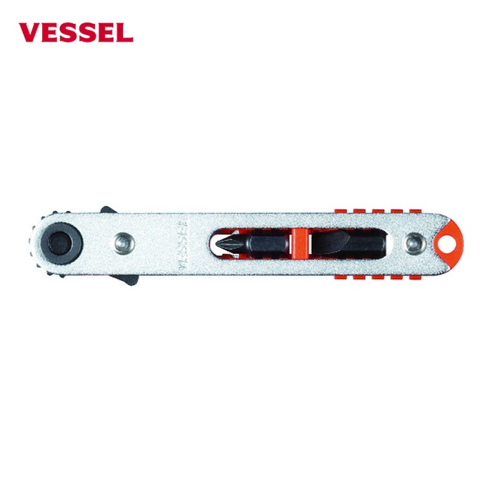 VESSEL オフセット式ラチェットドライバー|特長:業界最薄18mmヘッドで狭い場所での作業でより便利に使いやすくなっています。 本体はビット2本を収納可能、吊り下げ穴付です。 ラチェット破壊テストでは48。