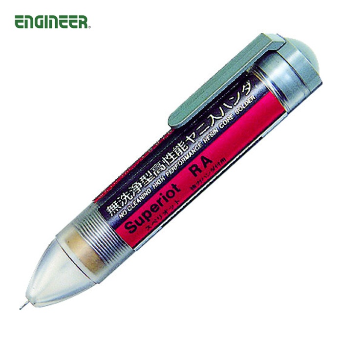 ENGINEER 糸はんだ|特長:活性の持続性が抜群で、従来はんだ付けできなかったステンレスなどにも優れた広がり率とはんだのぬれ性を発揮します。 フラックス残さに腐食性が全く無く、経年劣化による不良の発生がありません。 残さは非吸湿性、電気絶縁性に優れています。