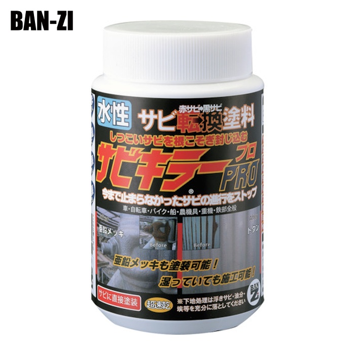 BANーZI サビ転換防錆剤|特長:サビに直接塗装することでサビの再発を予防でき、匂いもほとんどありません。 水性サビ転換塗料です。 密着性に優れ亜鉛メッキへの密着も良好です。