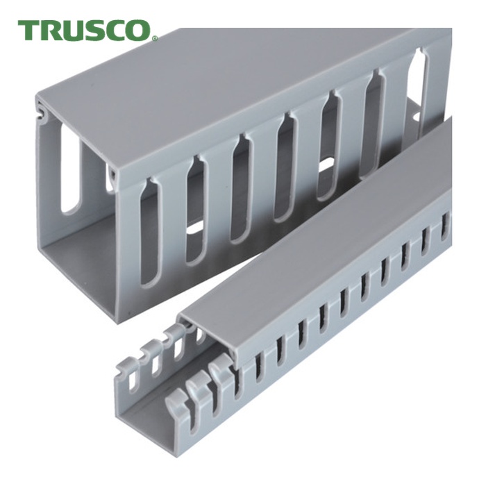 TRUSCO 配線ダクト|特長:取り回しやすい1Mタイプになります。 通線孔上部の切り込みから、電線を容易に通すことができます。