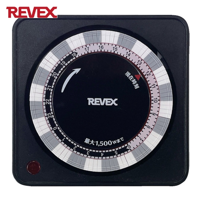 REVEX タイマー|特長:一度セットすれば毎日繰り返します。 15分単位で何回でも、毎日自動的に電気器具の電源を「入・切」します(入り切り最大48動作)。 ダイヤル全体が24時間で1回転して押し下げたコマの所(範囲)で通電します。