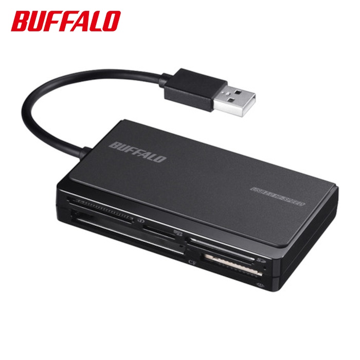 BUFFALO メモリリーダライタ|特長:高速転送規格UHS・I対応 読込最大40MB/sを実現・メディア間コピー可能+5メディア同時認識 ・57メディア(変換アダプター使用で+6)に対応 ・コネクターを本体に固定できるのでモバイルに最適 ・コンパクトフラッシュのピン折れを防ぐ ・ドライバーインストール不要 ・ACアダプター不要のバスパワーモデル ・Windows&Mac両対応 ・RoHS基準値準拠。