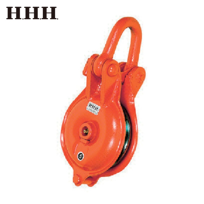 HHH 滑車|特長:シーブはベアリング入りですので回転がスムーズです。 上部が開くのでロープの途中からでも装着できます。