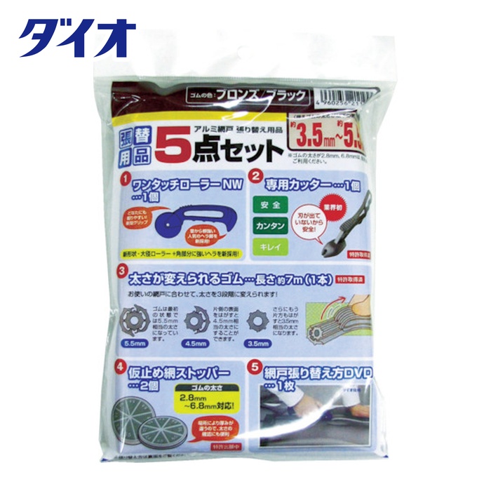 Dio 網戸用品|特長:網戸張り替えに必要な道具がそろった便利なセットです。 ワンタッチローラー・網戸専用カッター・太さが変えられるゴム・仮止めストッパー・網戸張り替え方DVDの5点セット品です。 5mm、4。