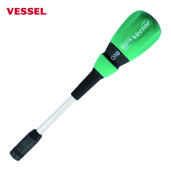 VESSEL ソケットドライバー|特長:六角ボルト・ナットを締めるソケットタイプです。 力がよく伝わる大径グリップを採用しました。 レンチがかけられる六角軸仕様です。