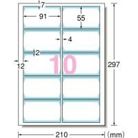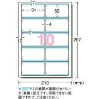 | 仕様・規格 | ● 色:白無地 ● 面付:2列×5段(10面) ● 1パック内:100片 ● ラベルサイズ(mm)縦:55 ● ラベルサイズ(mm)横:91 ● 総厚さ:0.26mm(51691は0.24mm)、カード厚さ:0.18mm ● シートサイズ:A4 ● インクジェット・レーザープリンタ兼用 |