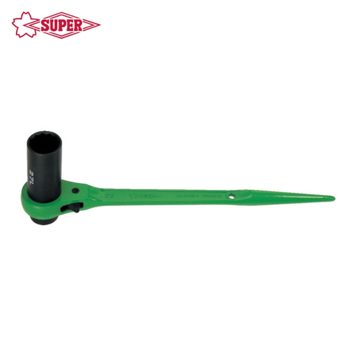 スーパー 両口ラチェットレンチ|特長:正逆は切り替え爪式です。 C形チャンネル・H形鋼チャンネル・アングルなどの深い凹部およびナット締め付け時にボルトが長く出る所の使用に便利です。 グリーン焼き付け塗装仕上げです。