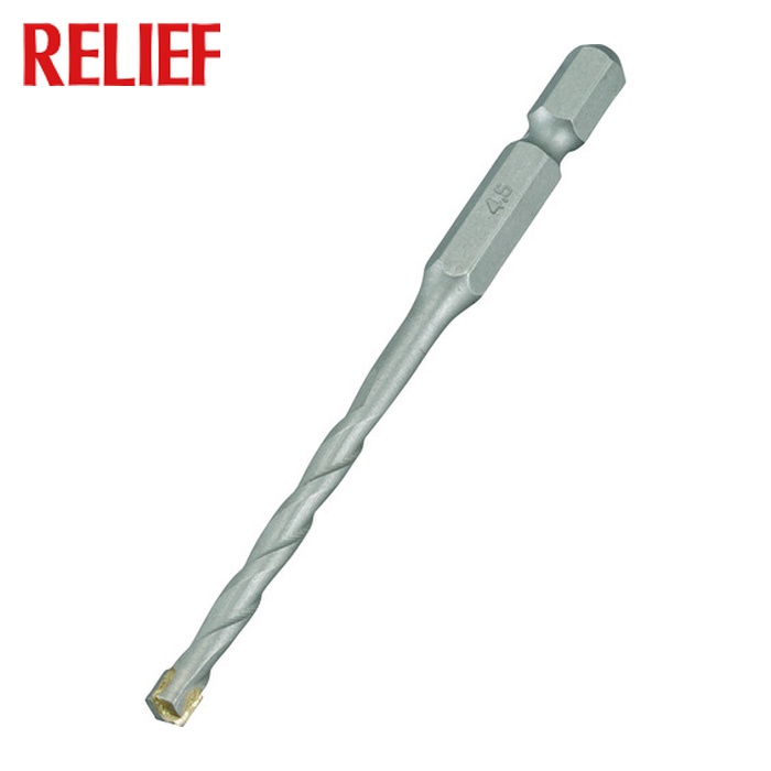 RELIEF コンクリートドリル(6.35六角軸)|特長:ブロック・モルタル・レンガ・タイル・ALCなどに使用できます。 六角軸一体成型加工で、耐久性に優れています。