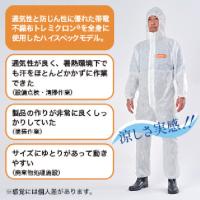 東レ 使い捨て保護服|特長:通気性と防じん性に優れた帯電不織布トレミクロン[[R下]]を全身に使用したハイスペックモデルです。 安全性に加えて、従来の防護服に課題としてあった不快感を軽減しました。 暑い季節や高温高湿の作業環境でも快適な着心地をキープし、作業性の向上に貢献します。